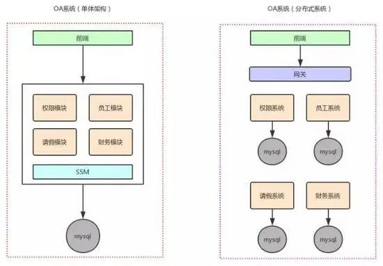 举个例子,假设原来你做了一个OA系统,里面包含了权限模块、员工模块、请假模块、财务模块,一个工程,里面包含了一堆模块,模块与模块之间会互相去调用,1台机器部署。