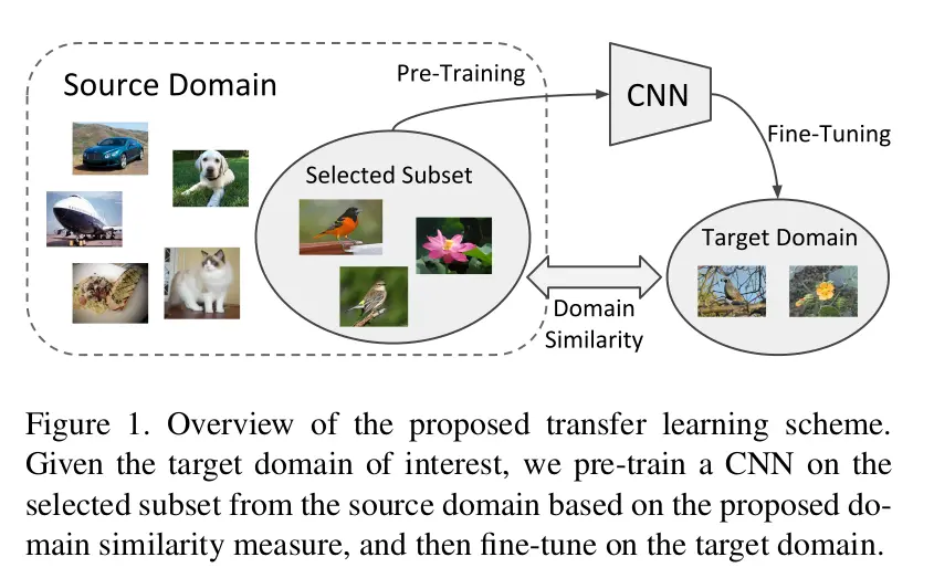 本节描述了从大型数据集上训练的网络到小型细粒度数据集的迁移学习。介绍了一种测量两个域之间视觉相似性的方法,并给出了在给定目标域的情况下,如何从源域中选择一个子集。