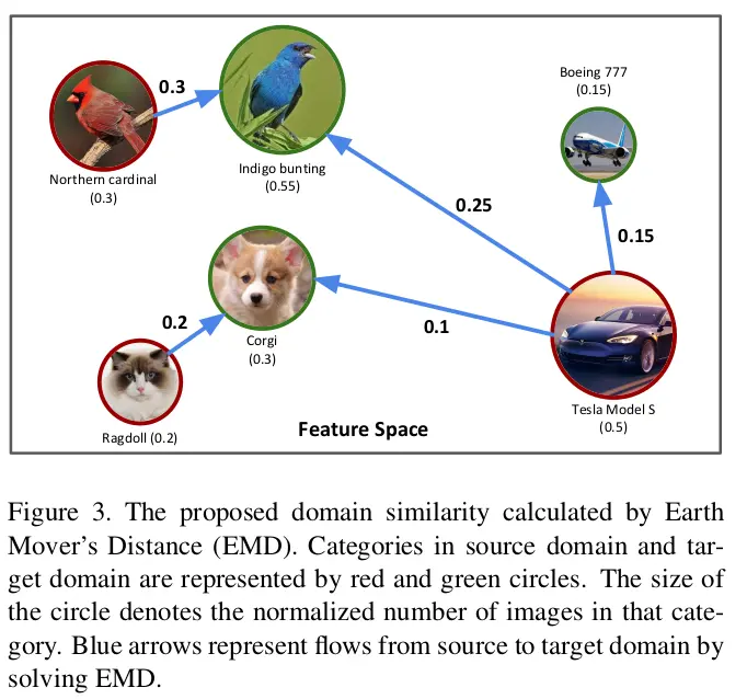 在这种假设下,转移学习可以被视为将一组图像从源域S移动到目标域T.需要通过将图像移动到另一个图像来完成的工作可以被定义为它们在等式1中的图像距离。 然后,两个域之间的距离可以定义为所需总工作量的最小值。 域相似性的这种定义可以通过地球移动器的距离(EMD)来计算。