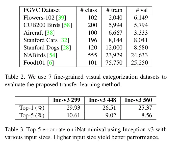 通过微调从大规模数据集(如ImageNet)中学习知识,为特定领域的细粒度视觉分类(fgvc,fine-grained visual categoriza- tion)任务(如识别鸟类或汽车品牌和模型)提供了有效的解决方案。在这种情况下,数据标注经常会需要专门的领域知识,因此数据集很难扩大规模。在本文工作中,我们首先要解决一个FGVC任务的大规模数据集问题。我们的方法在iNaturalist2017大规模物种分类挑战中获得第一名。我们的方法成功的核心是使用更高的用来训练的图像分辨率和处理训练数据的长尾分布。接下来,我们通过研究迁移学习从大规模数据集微调到小规模的,特定领域的FGVC数据集。我们提出了通过Earth Mover的距离进行域相似性估算方法,,并证明转移学习可以从与此目标域类似的源域上的预训练中获益。我们提出的转移学习优于ImageNet预训练,并在多个常用的FGVC数据集上获得最出色的结果