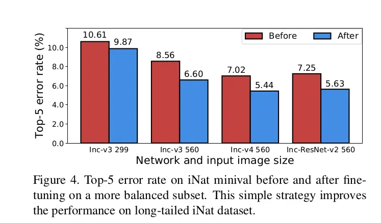 由于iNaturalist数据集[55]中各类别的图像数量高度不平衡,我们发现在代表性不足的尾部类别上表现不佳。 我们认为这主要是由两个原因引起的:1)缺乏训练数据。 iNat训练集中大约1,500个细粒度类别的图像少于30个。 2)训练期间遇到的极端不平衡:最大类和最小类中的图像数之间的比率约为435.没有对训练图像进行任何重新采样或重新加权损失,具有更多图像的类别 头部将主导那些尾巴。 由于我们在第一期缺乏训练数据方面做得很少,我们提出了一种简单有效的方法来解决第二类不平衡问题。