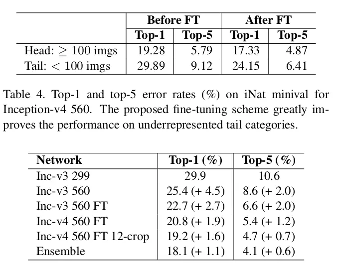 为了验证所提出的大规模细粒度分类学习方案,我们对iNaturalist 2017数据集进行了大量的实验。为了获得更好的性能,我们从ImageNet预训练的网络中进行微调。如果从头开始训练INAT,前5个错误率≈1%更差。 我们训练了具有3种不同输入分辨率(299、448和560)的Inception-v3。图像分辨率的影响如表3所示。从表中可以看出,使用更高的输入分辨率可以在INAT上获得更好的性能。 我们提出的处理长尾分布的微调方案的评估如图4所示。通过对学习率较小的更平衡子集(我们的实验中为10-6)进行进一步微调,可以获得更好的性能。表4显示了通过微调对头部和尾部类别进行的性能改进。训练图像大于或等于100的头部类别的改善率分别为前1名的1.95%和前5名的0.92%;而训练图像小于100的尾部类别的改善率分别为前1名的5.74%和前5名的2.71%。这些结果验证了所提出的微调方案大大改善了表现不足的尾翼类的性能。