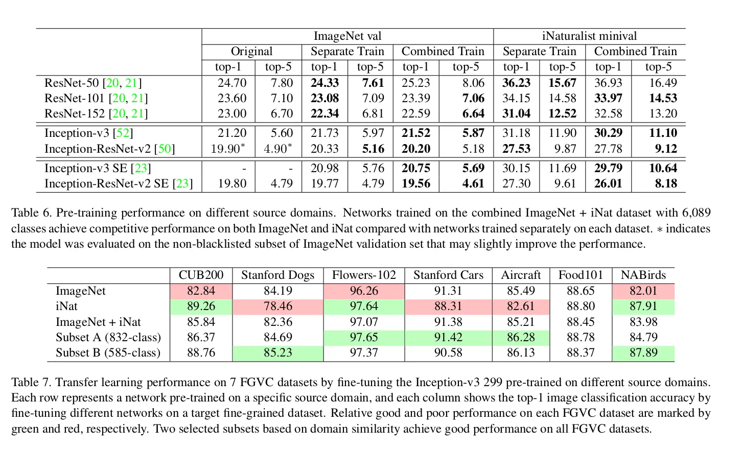 我们通过对源域上的网络进行从头开始的预训练,然后对目标域进行微调,从而对所提出的传输学习方法进行评估,以实现细粒度的可视化分类。除了在Imagenet和INAT上分别进行训练外,我们还在一个组合的Imagenet+INAT数据集上训练网络,该数据集包含来自6089个类别的1946640个训练图像(即,来自Imagenet的1000个和来自INAT的5089个)。所有网络均采用299×299的输入尺寸。表6显示了在IMAGENET VAL和INAT MiniVAL上评估的训练前绩效。值得注意的是,在组合的IMAGENET+INAT数据集上训练的单个网络与单独训练的两个模型相比,具有竞争性的性能。总的来说,在开始和开始SE的情况下,联合训练优于单独训练,而在resnet的情况下则更糟。基于SEC中定义的建议域选择策略。4.2,我们从组合的IMAGENET+INAT数据集中选择以下两个子集:A子集是通过包含7个FGVC数据集的前200个IMAGENET+INAT类别来选择的。删除重复的类别会导致源域包含832个类别。B子集是通过增加CUB200、Nabirds、Stanford Dogs前100个类别和Stanford Cars and Aircraft前50个类别中最相似的400个类别来选择的,总共给我们提供了585个类别。图6显示了根据我们提出的域相似性计算的所有fgvc数据集在imagenet+inat中最相似的10个类别。很明显,对于cub200、flowers-102和nabirds来说,最相似的分类来自于inat;而对于斯坦福狗、斯坦福汽车、飞机和food101来说,最相似的分类来自于imagenet。这表明IMAGENET和INAT中的数据集偏差很大。