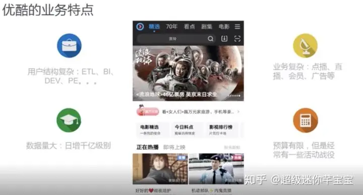 第二个特点就是业务复杂,优酷是一个视频网站,它有非常复杂的业务场景,从日志分类上,除了像页面浏览,还会有一些播放相关的数据、性能相关的数据。从整个的业务模式上,有直播、有会员、有广告、有大屏等这样一些非常不一样的场景。