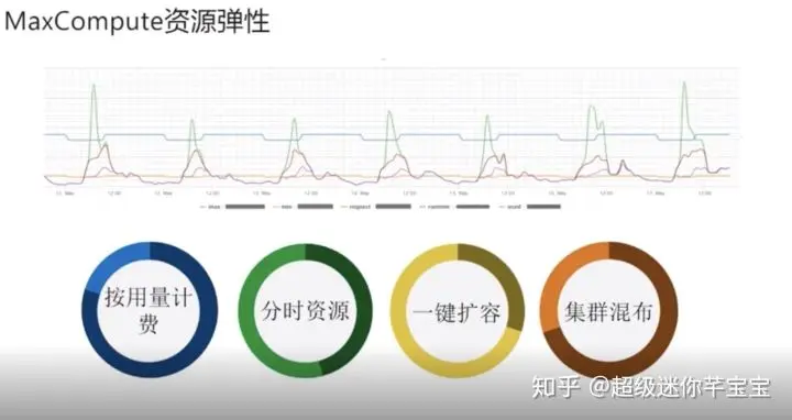 第二个,实际上MaxCompue计算资源是可以分时的,比如说生产队列,凌晨的时候会调高一些,保证报表能够尽快出来。到白天时候,让开发的计算资源高一些,可以让分析师、开发去临时跑一些数据,会更顺畅一些。