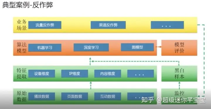这张图大部分互联网公司不太会涉及到,就是关于反作弊的问题。这个是我们在MaxCompute做的一个反作弊的架构,通过原始的数据去提取它的特征,然后再通过算法模型,包括机器学习、深度学习、图模型去支持流量反作弊、渠道反作弊等等。再通过业务场景上反作弊的监控工具,把监控到的作弊信息去打一个黑白样本,再把这个黑白样本跟特征一起来不断的迭代优化算法模型。同时针对算法模型,做一个模型的评价,不断来完善反作弊体系。
