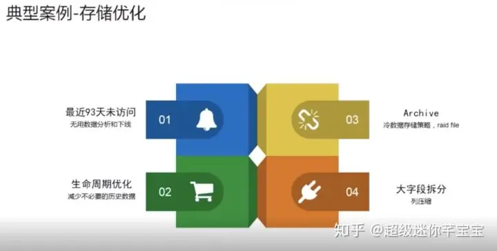 最后一页是存储的优化,因为像一些关键的原始数据或者是需要审计的数据是不能删的,永久不能删的。实际上就会造成我们数据存储的趋势是一直往上不减的,计算会在某一个时间点达到一个平衡。当前用这么多的计算资源,再往后,其实应该也不会再大涨了,比如说旧的业务逻辑下掉了,会换新的业务逻辑,这样会保持在一个相对平稳的波动上面。但是储存,因为它有一些历史的数据是永远不能删的,可能会出现一直在增长,而且是指数级的。所以我们也会持续关注存储的情况,还是通过大数据来治大数据,去看哪些表的访问跨度比较小,来去做生命周期的优化,来去控制它的增速。还有刚才提到的Aliorc,实际上也是做压缩的。我们会去做一些大字段的拆分,来提高压缩的比例。