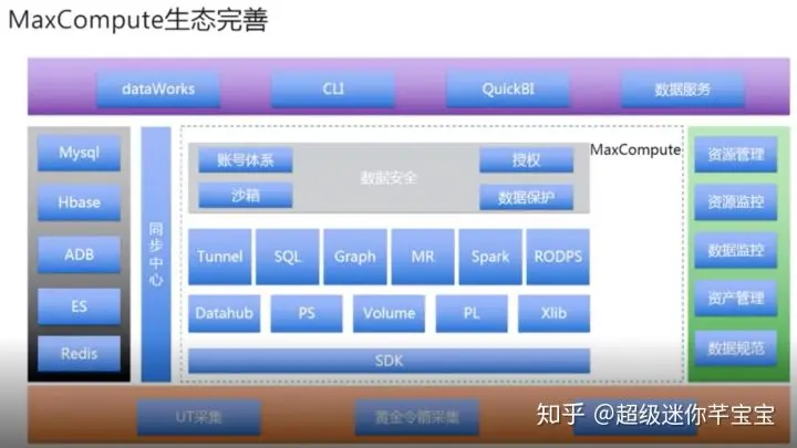 第二个特点,完整的生态。优酷在2017年之前是完全基于Hadoop的生态,迁到MaxCompute之后,是基于阿里云提供的Serverless大数据服务的生态。大家可以在开源上看到的组件,在整个的MaxCompute上都是有的,而且比开源的要更好用、更简单。从架构图上可以看到,我们中间是MaxCompute,左侧依赖的Mysql、Hbase、ES、Redis这些都是由同步中心去做一个双向的同步。右侧会有资源管理、资源监控、数据监控,包括数据资产,还有一些数据规范。我们下层的数据输入,包括一些集团的采集工具,再往上边,有提供给开发人员用的DataWorks,包括一些命令行的工具;有提供给BI人员用的QuickBI及数据服务。