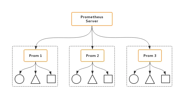 联邦功能是一个特殊的查询接口,允许一个prometheus抓取另一个prometheus的metrics,已实现分区的目的。如下所示: