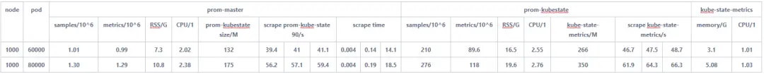 对于Prometheus master与Prometheus kube-state在1分钟抓取时间内最多可支持8w pod,主要瓶颈在于kube-state-metrics随着pod增加,数据量激增,一次抓取耗时不断增长。