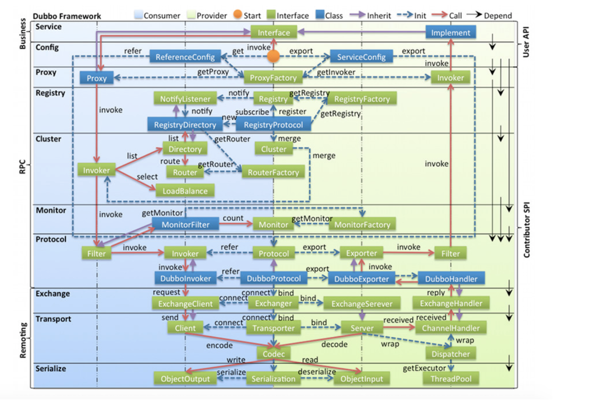 图中的Provider和Consumer是抽象的概念,只是想让看图者更直观的了解哪些分类是分属于客户端于服务端,不用Client和Server的原因是Dubbo在很多场景下都使用Provider,Register,Monitor划分逻辑拓扑节点,保持统一概念。