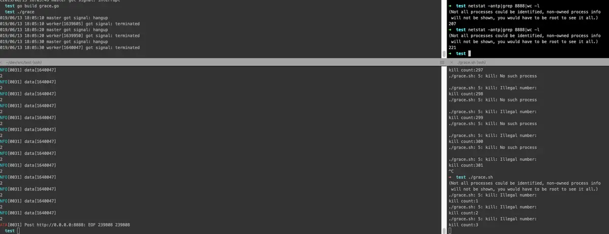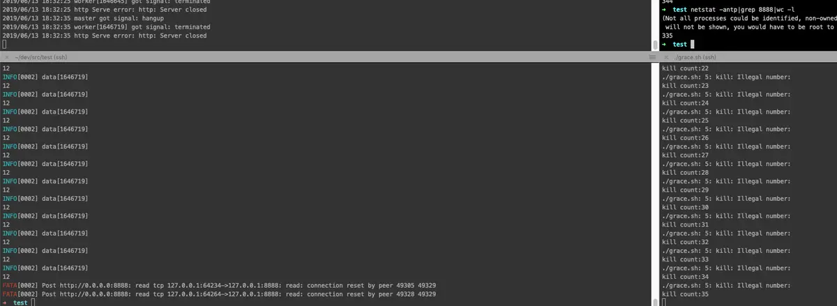 这里简单描述的我用的graceful的原理,它是一个master-worker模式,master常驻,只处理信号和像worker发送terminate信号,worker负责web服务,在收到信号之后会进行shutdown操作,逻辑就这些。