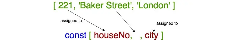 在上面的代码中,我们从数组 list 中解构出数组索引 0 和 1 所对应的值并分别存储至变量 houseNo 和 street 中。