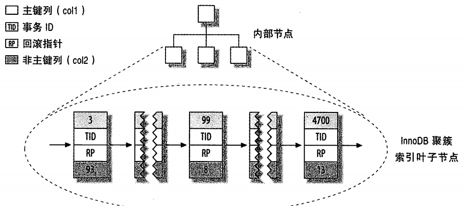 每个叶子节点都包含了主键值,事务id, 回滚指针(用于事务和mvvc),以及所有剩余的列(这个例子是col2)