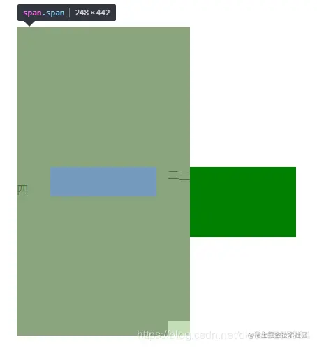 下面我会一点点解释这三个点,在这之前,我们可以明确一点,就是padding的百分比值是基于父元素的宽度进行计算的,在本例中,上下左右的padding值均为400px*50%=200px。(关于padding:50%和padding在内联元素中的表现请关注本章对padding基础的一些总结和归纳。)因此该内联元素最终的宽度=内联元素content的宽度+左右padding的值。可以确定的是,这个宽度一定>父级元素的宽度,所以该元素会自动断行也就不奇怪了。至此,我们已经向前迈出了一小步。我们可以看到,"四"这个字,确实是换行了。