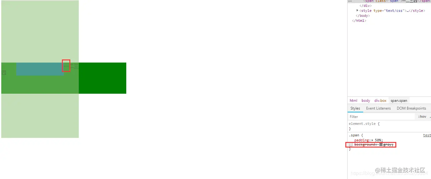 这个时候,我们需要做一点小小的改变,我们把内联元素的背景色去掉,看看会发生什么。