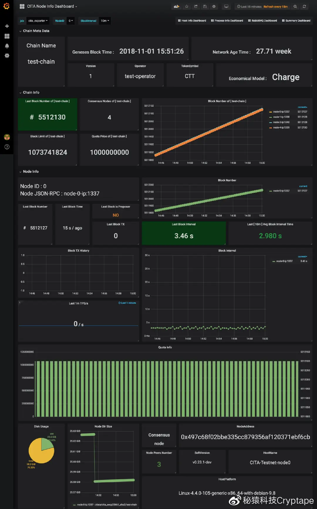 节点出块高度历史、出块时间、出块间隔趋势、Quota、交易量历史、TPS、磁盘占用比例、数据目录大小增长趋势