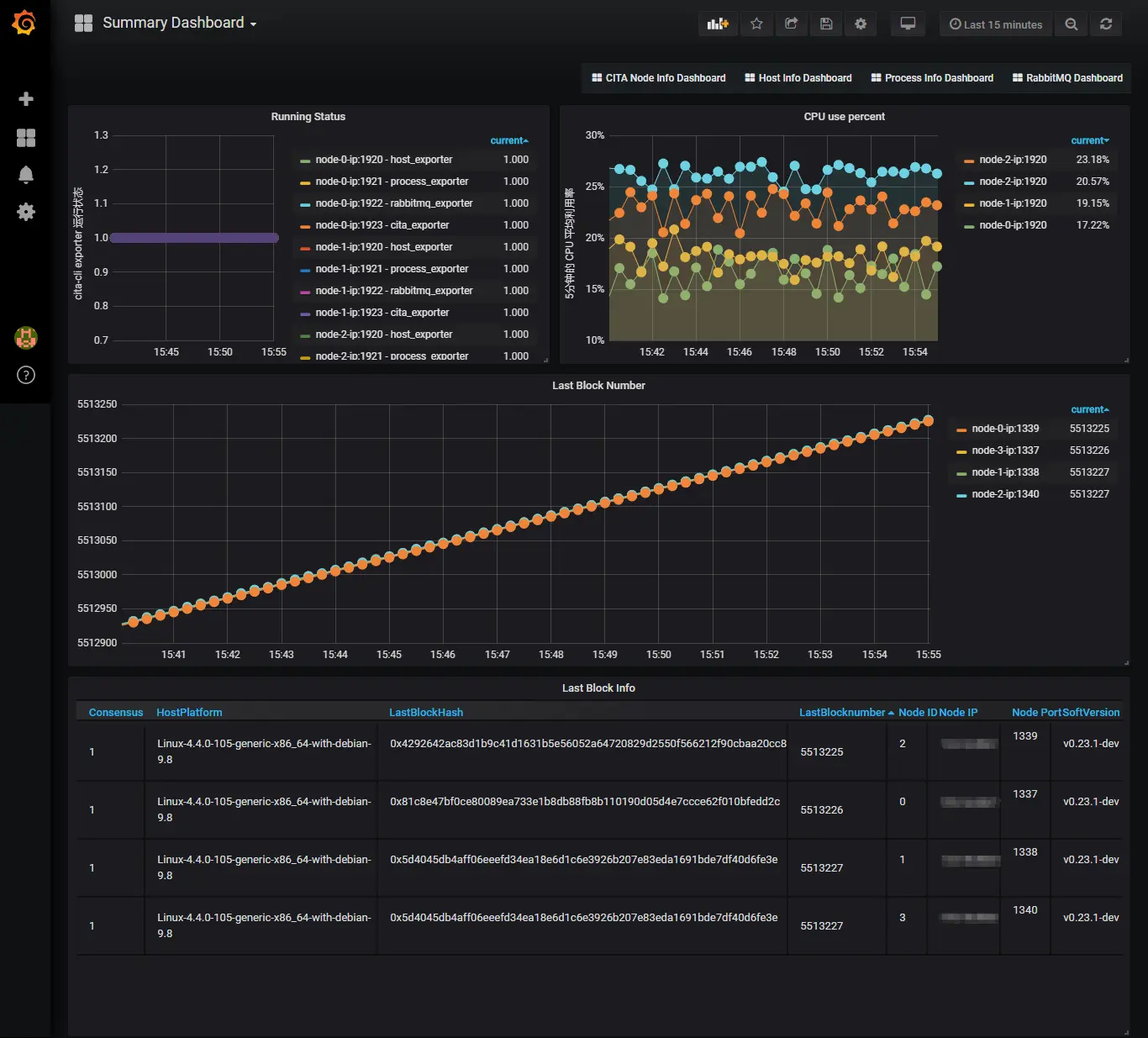 CITA-Monitor 监控的指标包括:区块链数据、服务进程状态、运行环境的 CPU /存储器/磁盘使用率等主机信息等。