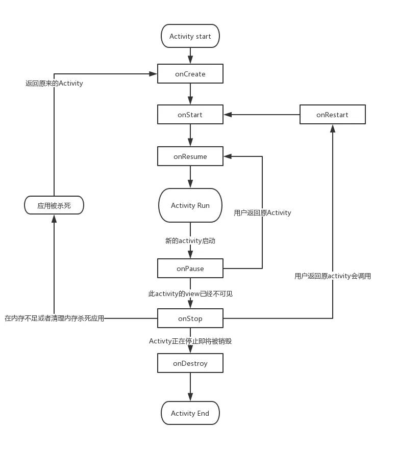 Activity的生命周期,在完整的生命周期中,像某些方法是成对出现的onCreate和onDestroy ,onStart和onStop, onResume 和onPause ,而两个特别的生命周期方法会在特殊的场景中被调用,那就是 onStop、onPause,onstop出现代表着这个activity视图对用户是不可见的, 而onPause方法出现,如果这个Activity视图在某个视图的下层但是是可以被看到,那么判断这个Activity 在前台。那么会有这样一个当一个activity A启动另一个activityB 时候 最先执行完A的opause后 方能执行B的 onresume 有源码可见 。 2.异常情况下的生命周期如系统因内存不足而杀死的activity 和配置状态改变如横竖屏的切换,那么在异常状态下 会重新走一遍生命周期,从onRestart开始,那么在这个过程中会有数据的存储 如TextView 的 edittext的数据存, 系统保存数据流程为 系统自动调用onSaveInstancesState 保存数据,并将数据委托给Window 保存,然后window在委托他的上层顶层容器去保存,也就是 groupview保存(一般来讲这个view是decorView)顶层容器 在一一通知他的子view保存数据。委托思想。
