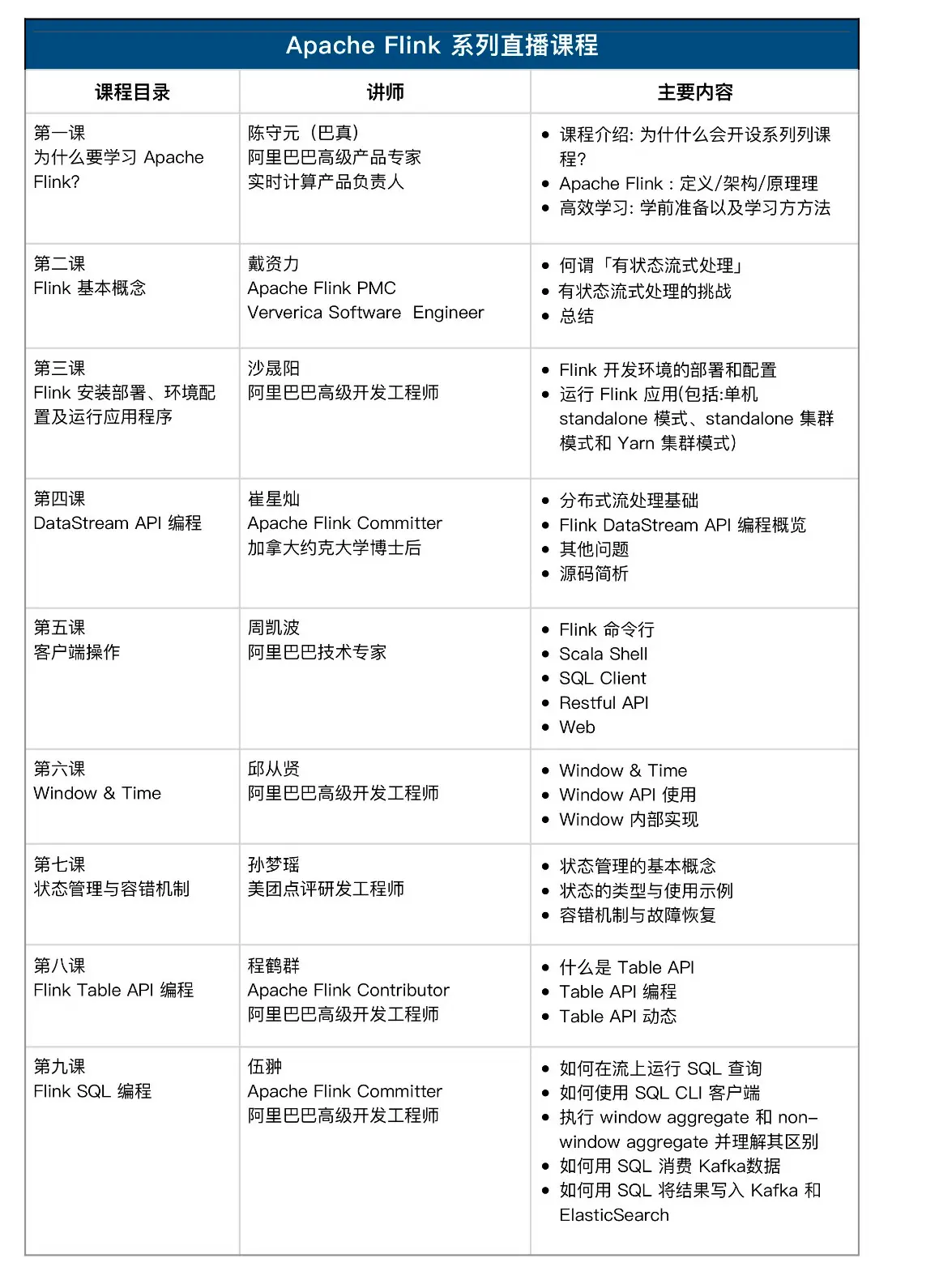 此次免费公开课共分为9个课时,课程内容包含 Flink 的基础架构、应用场景、集群部署、运行机制、编程范式,为你系统地拆分讲解大数据计算开发引擎Flink。