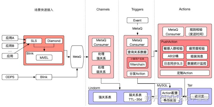 Action层处理对象是Trigger触发后计算的用户名单,可以给名单里的用户发Push,发权益或者其他定制逻辑。Action本身是标准化、可插拔的组件,业务上可以利用Action组件对用户名单做AB测试,快速实验不同Action策略。