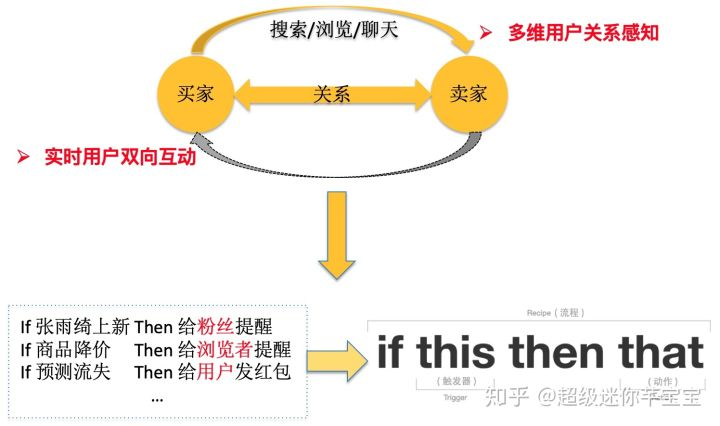 在现有的玩法中,买家可以通过多种行为与卖家产生联系,但卖家不能主动与买家发生关系和互动;而且平台计算的关系都是离线的,对用户的吸引力不足。