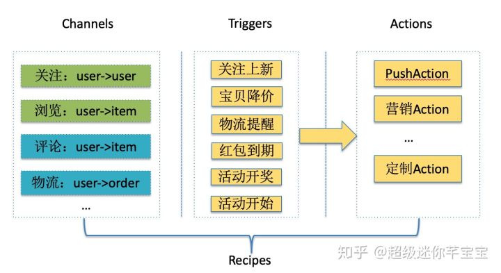 首先按照IFTTT规范对业务进行建模,分为Channel、Trigger和Action层,其中Channel层是数据底层,将Trigger和Action关联后组成标准Recipe。