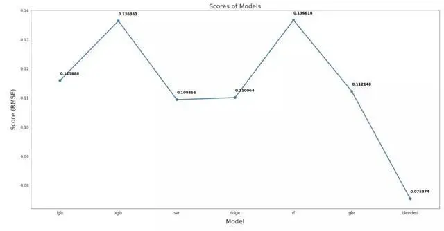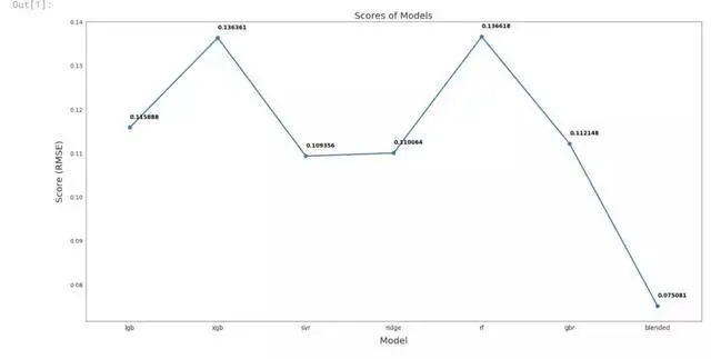 从下图可以看出,混合模型的RMSLE(均方根对数误差)为0.075,远优于其他模型。