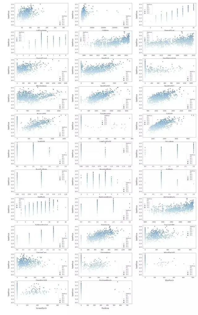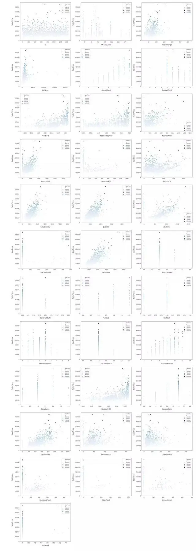 并绘制出这些特征之间的关系,以及它们与销售价格的关系。