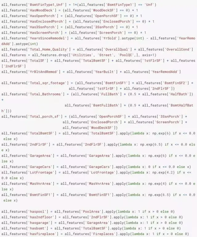 ML模型很难识别更复杂的模式,所以我们可以基于对数据集的直觉创建一些特征来帮助我们的模型,比如,每个房子地板总面积、浴室和门廊面积。