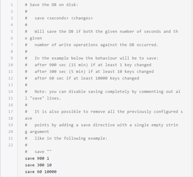 上面三组命令也是非常好理解的,就是说900指的是“秒数”,1指的是“change次数”,接下来如果在“900s“内有1次更改,那么就执行save保存,同样