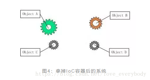 大家看到了吧,由于引进了中间位置的“第三方”,也就是IOC容器,使得A,B,C,d这4个对象没有了耦合关系,齿轮之间的传动全部依靠“第三方”了,全部对象的控制权全部上缴给“第三方” IOC容器,所以,IOC容器成了整个系统的关键核心,它起到了一种类似“粘合剂”的作用,把系统中的所有对象粘合在一起发挥作用,如果没有这个“粘合剂”,对象与对象之间会彼此失去联系,这就是有人把IOC容器比喻成“粘合剂”的由来。