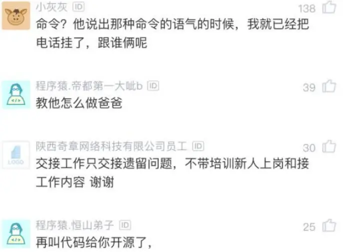 最近网上就有一名程序员留言说自己被曾经的公司开除,但是现在老板给他打电话,要求他回去给前同事讲清楚代码。这名程序员抱怨的点就是自己已经被开除,工作也做了正常的交接,但是现在却以命令的语气让自己回去讲代码,自己心里是很不愿意的。