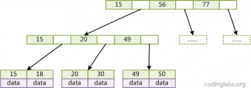 B+Tree的数据结构如下,是BTree的升级版,区别是非叶子节点不在存储具体的数据,只保存索引的键,数据保存到叶子节点中,并且叶子节点中没有指针只有键和数据。B+Tree的优点是:搜索效率更高,因为非叶子节点中没有保存数据,就可以保存更多的键,每一层的键越多,树的高度就会减少,这样查询速度就会提升。