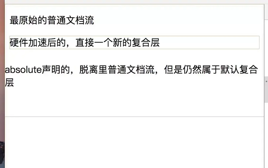 可以看到,absolute虽然可以脱离普通文档流,但是无法脱离默认复合层。 所以,就算absolute中信息改变时不会改变普通文档流中render树, 但是,浏览器最终绘制时,是整个复合层绘制的,所以absolute中信息的改变,仍然会影响整个复合层的绘制。 (浏览器会重绘它,如果复合层中内容多,absolute带来的绘制信息变化过大,资源消耗是非常严重的)