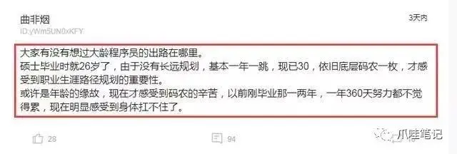 该位程序员大致意思是这样。不知道各位职场人有没有想过大龄程序员的出路在哪里?自己在硕士毕业时就已经26岁了,由于当时年轻也没有过多考虑,也没有给自己人生做长远规划,基本上每份工作都是一年一跳,现已30岁了,依旧还是最底层的码农一枚,如今而立之年才感受到职业生涯路径规划的重要性。或许是自己年龄的缘故,现在才感受到了码农的辛苦,刚毕业那一两年,一年365天努力都不觉得累,现在明显感受到身体扛不住了。而且脑子学习新东西的速度也明显下降,记忆力也慢慢不行了。