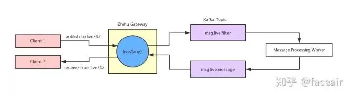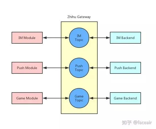 所以我们尝试使用经典的发布订阅模型来解耦长连接网关跟客户端与业务后端,它们之间只需要约定 Topic 即可自由互相发布订阅消息。