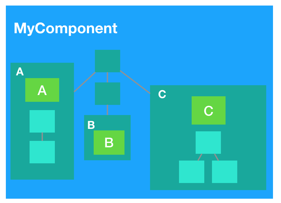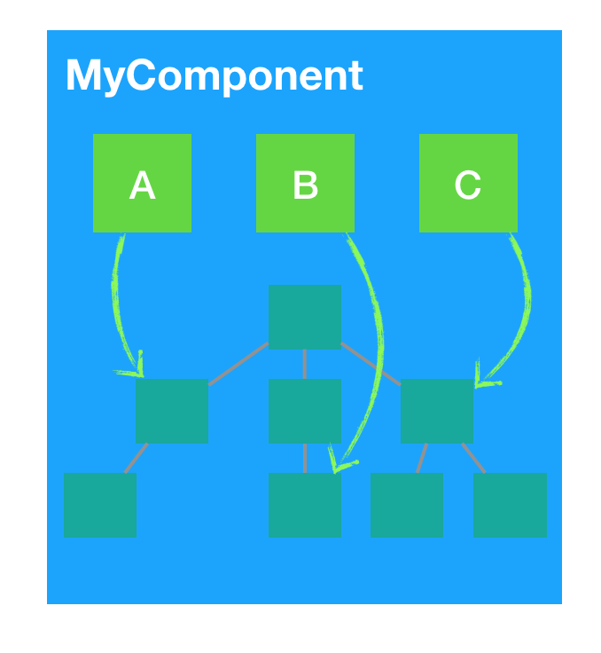 举个例子,现在有一个 MyComponent 组件,依赖于 A、B、C 三个数据源,来构建一个 vdom 树。现在的问题是什么呢?现在只要 A、B、C 任意一个变动,那么 MyComponent 整个就会重新渲染: