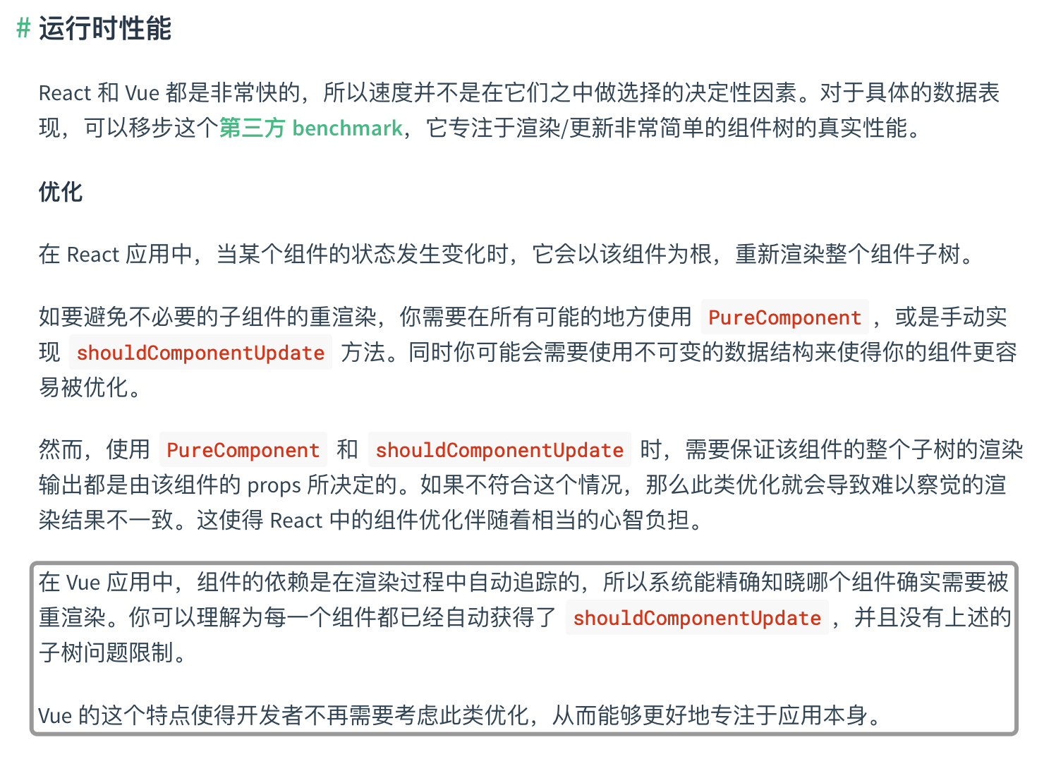 Vue 和 Mobx 宣称自己性能好的一部分原因是它们的'响应式系统', 它允许我们定义一些‘响应式数据’,当这些响应数据变动时,依赖这些响应式数据视图就会重新渲染. 来看看 Vue 官方是如何描述的: