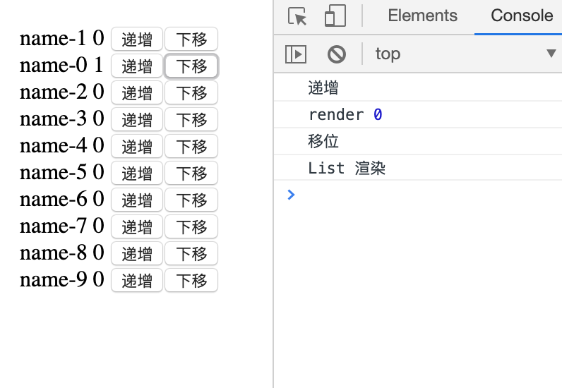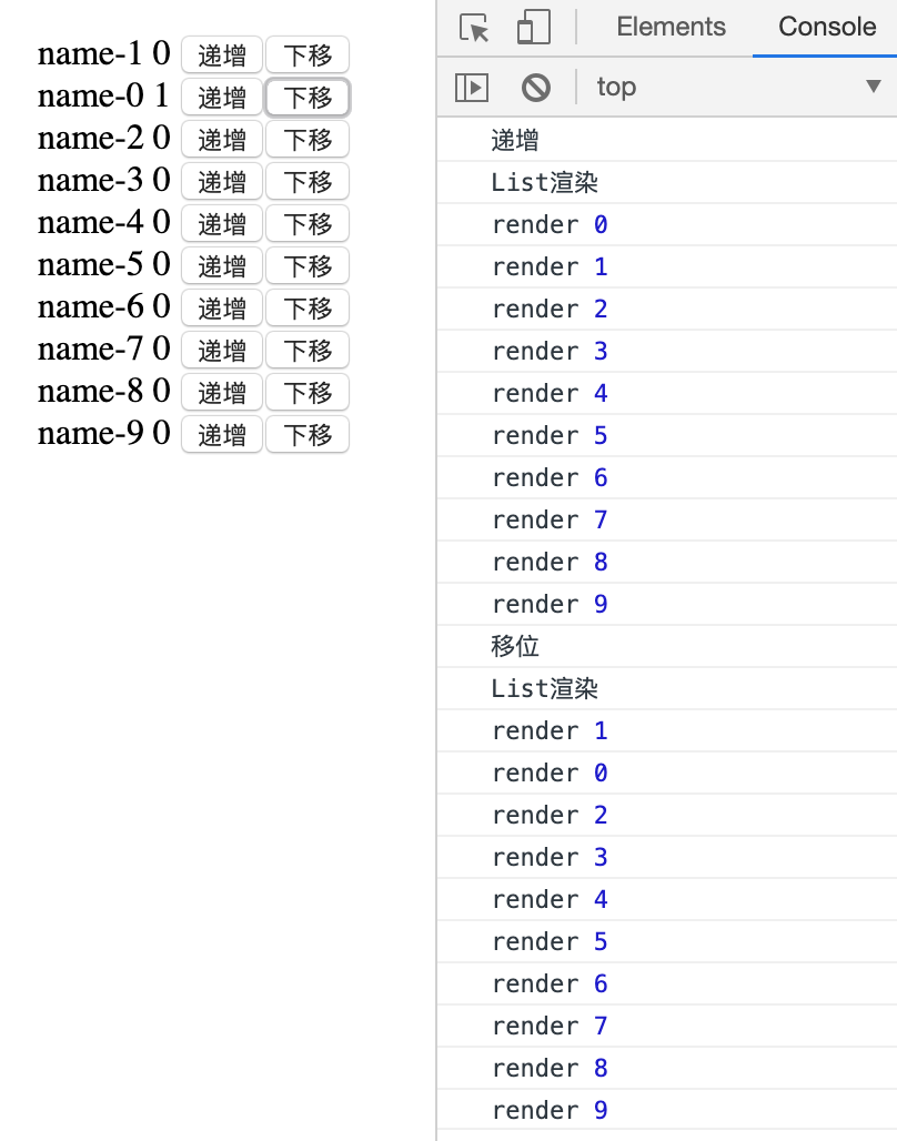 效果很明显, list-item 递增只会重新渲染本身; 而移位只会重新渲染 List, 因为列表项没有变动, 所以下级 list-item 也不需要重新渲染: