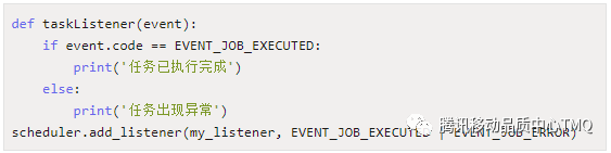 可以给调度器添加事件监听器,调度器事件只有在某些情况下才会被触发,并且可以携带某些有用的信息。通过给 add_listener() 传递合适的 mask 参数,可以只监听几种特定的事件类型,具体类型可看源码中的 event.exception 或者 event.code 值来做识别判断。