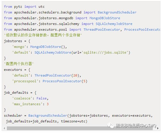下面进行一个复杂的配置,同时使用两个作业存储和两个执行器,在这个配置中,修改默认的配置参数,jobstored指的是job持久化,默认job运行在内存中,可持久化在数据库,指定为mongo的MongoDBJobStore或者是使用sqlite的SQLAlchemyJobStore,同时可指定多种jobstore。