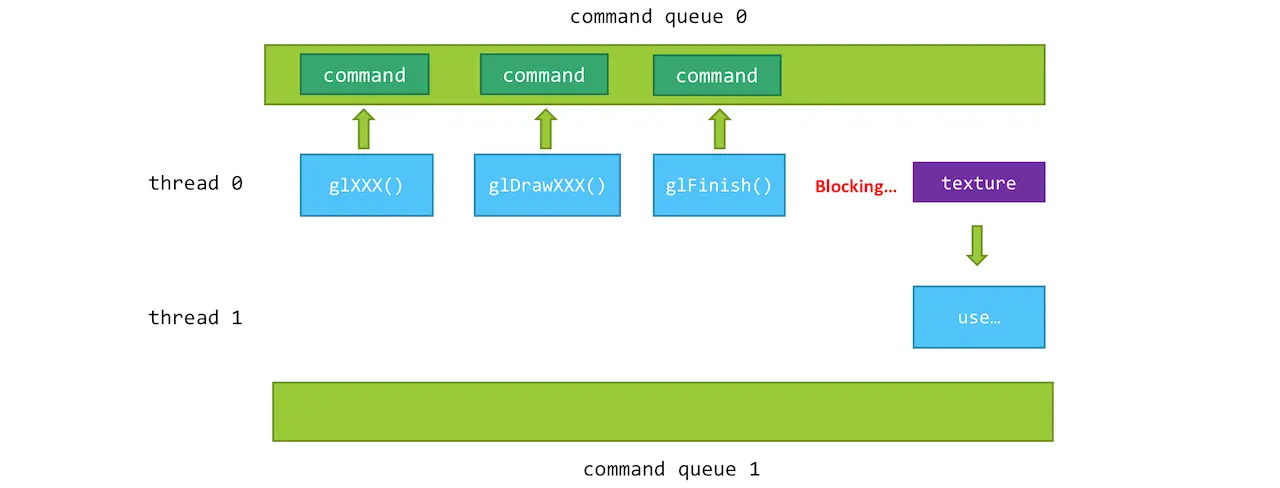 由于glFinish()要在CPU上等待,因此会对性能造成一定的影响,如果thread0是一个主渲染线程,那就会对帧率产生影响,因此把等待放到比较次要的thread1中会比较好,但是我们把glFinish()放到thread1可以吗?来看下面这张图: