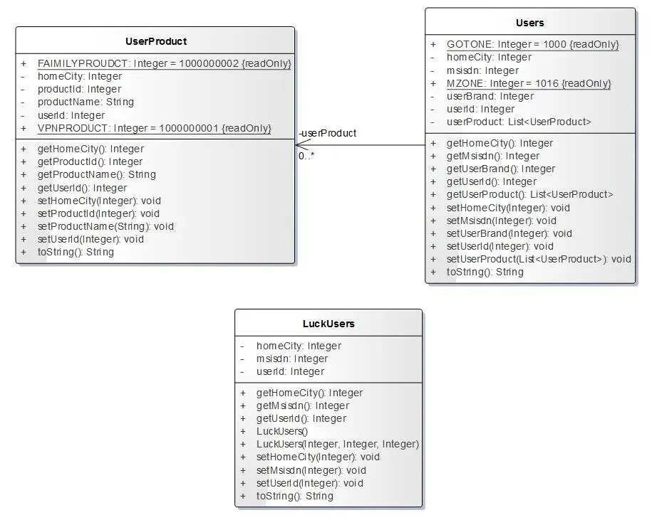 我们发现,这里实际上有三个实体,一个是用户,一个是用户订购的产品,一个是幸运客户。并且一个用户是可以订购多个产品的,用户的品牌有动感地带,此外还有全球通。主要针对的产品是VPN产品(VPNPRODUCT)和家庭产品(FAIMILYPROUDCT),于是我们画出如下的类图结构: