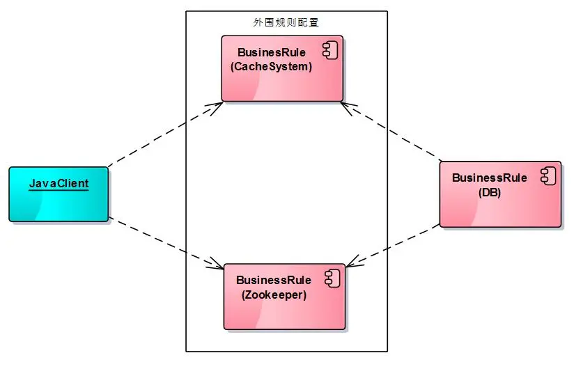 主要从两方面考虑,把常用的业务规则脚本放置到数据库进行存储,后续为了节省程序的IO开销,可以通过缓存机制从数据库从增量拷贝业务规则的镜像,程序客户端直接同缓存打交道。目前基于Java可以考虑的缓存框架也有很多,比如JCS(Java Caching System)。另外一个方面如果一个系统是分布式架构,可以考虑通过Zookeeper上面的节点进行业务规则的分布式部署,也可以实现规则的灰度版本发布、业务规则的动态事件监控等等操作。同样的,程序客户端可以直接同Zookeeper的某个节点通信,获得业务规则的数据,Zookeeper本身也会自动同步数据库中的业务规则。综上所述,得到如下图所示的业务规则引擎架构