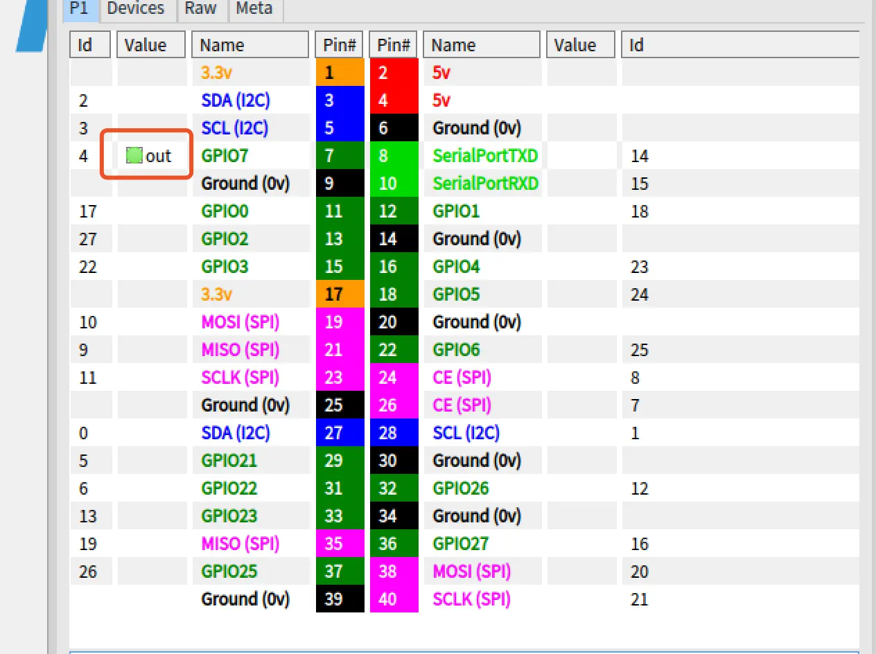 在shell中将7号引脚设为开启状态: gpio write 7 1
