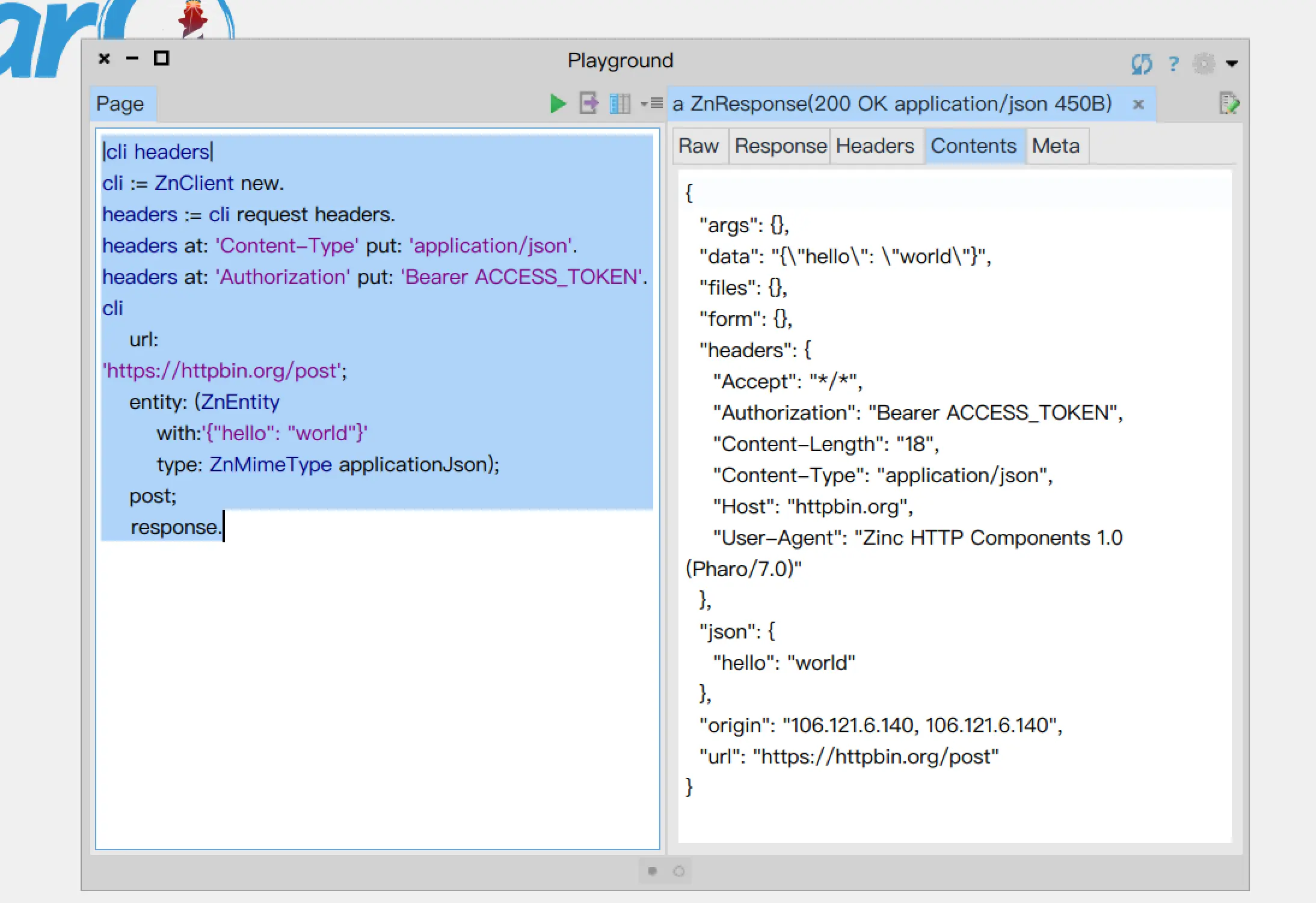 headers at: 'Authorization' put: 'Bearer ACCESS_TOKEN'.