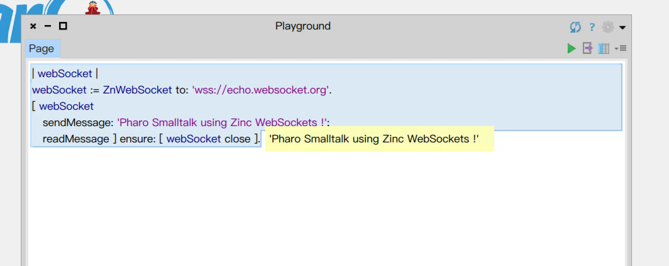 sendMessage: 'Pharo Smalltalk using Zinc WebSockets !'; ] value.