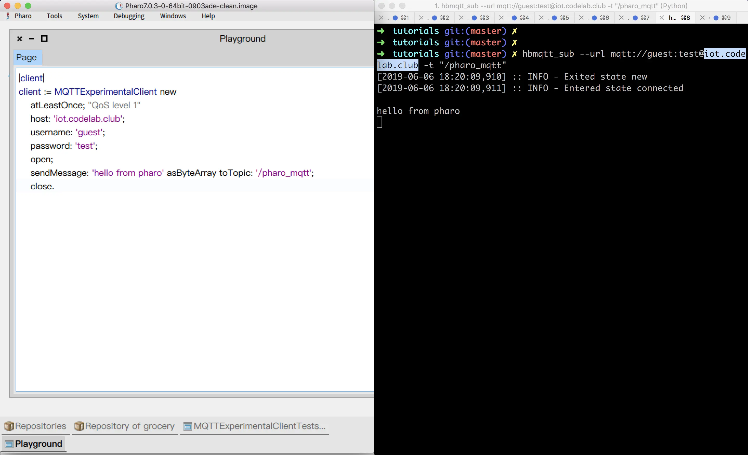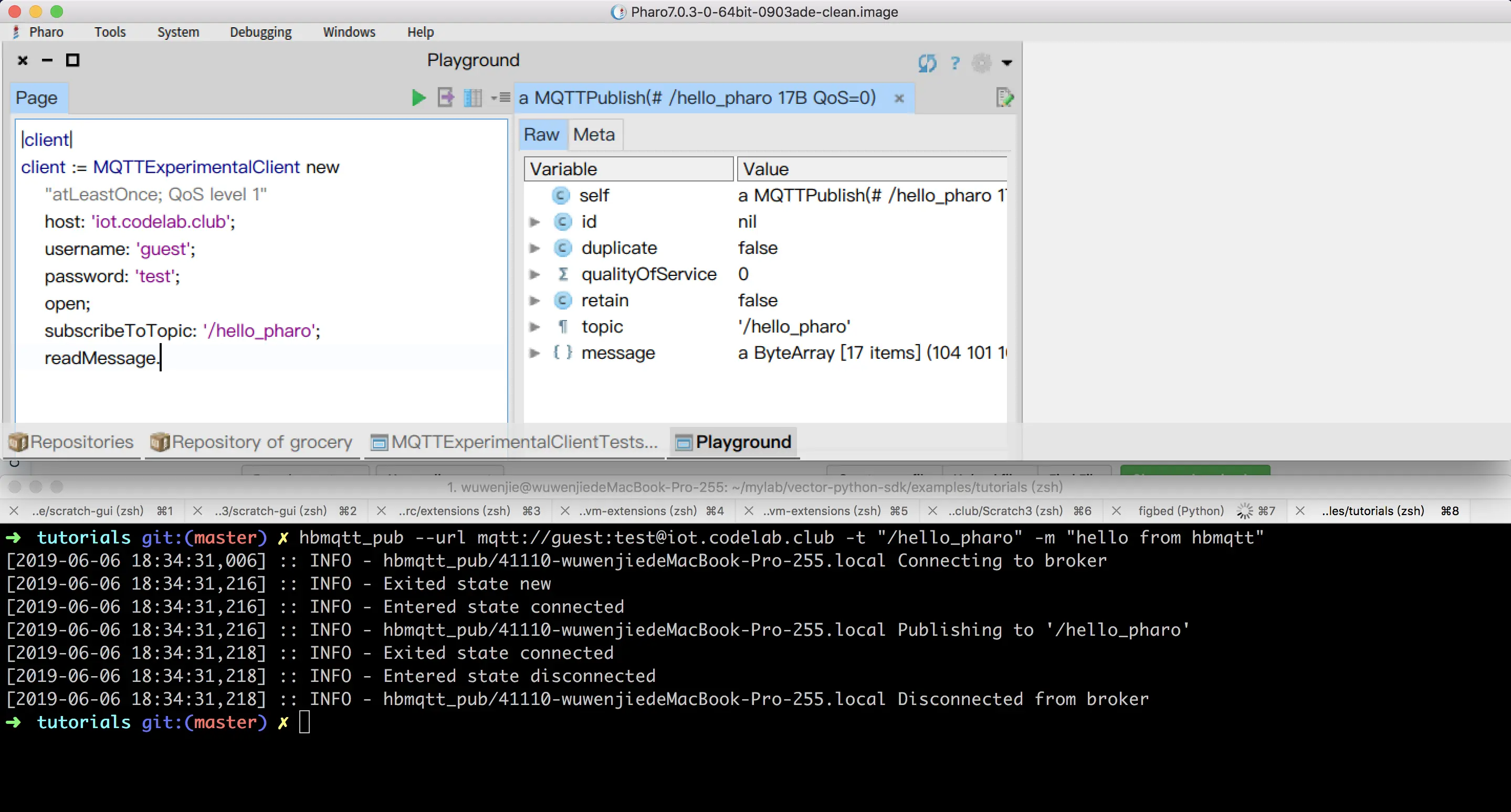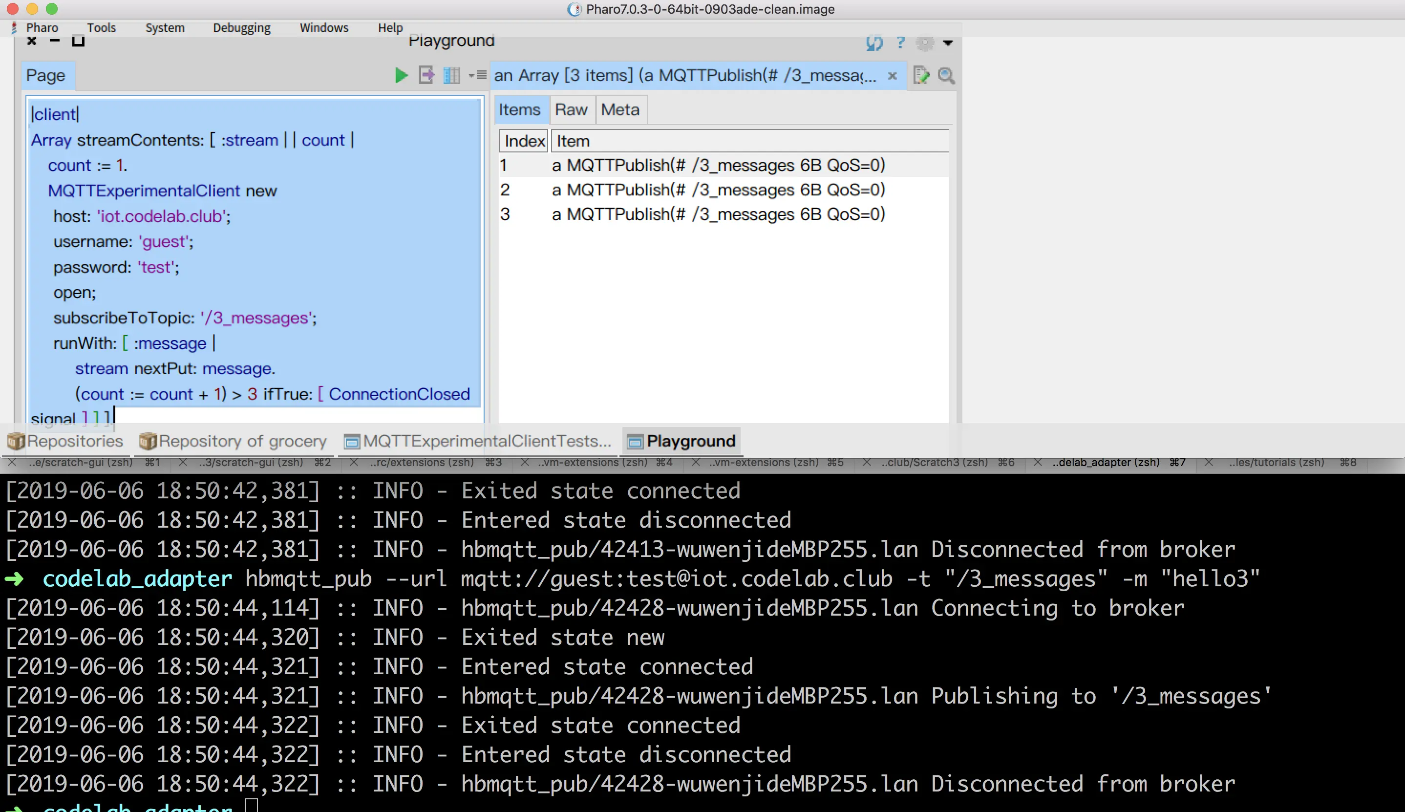 在命令行里运行hbmqtt_sub --url mqtt://guest:test@iot.codelab.club -t "/pharo_mqtt"