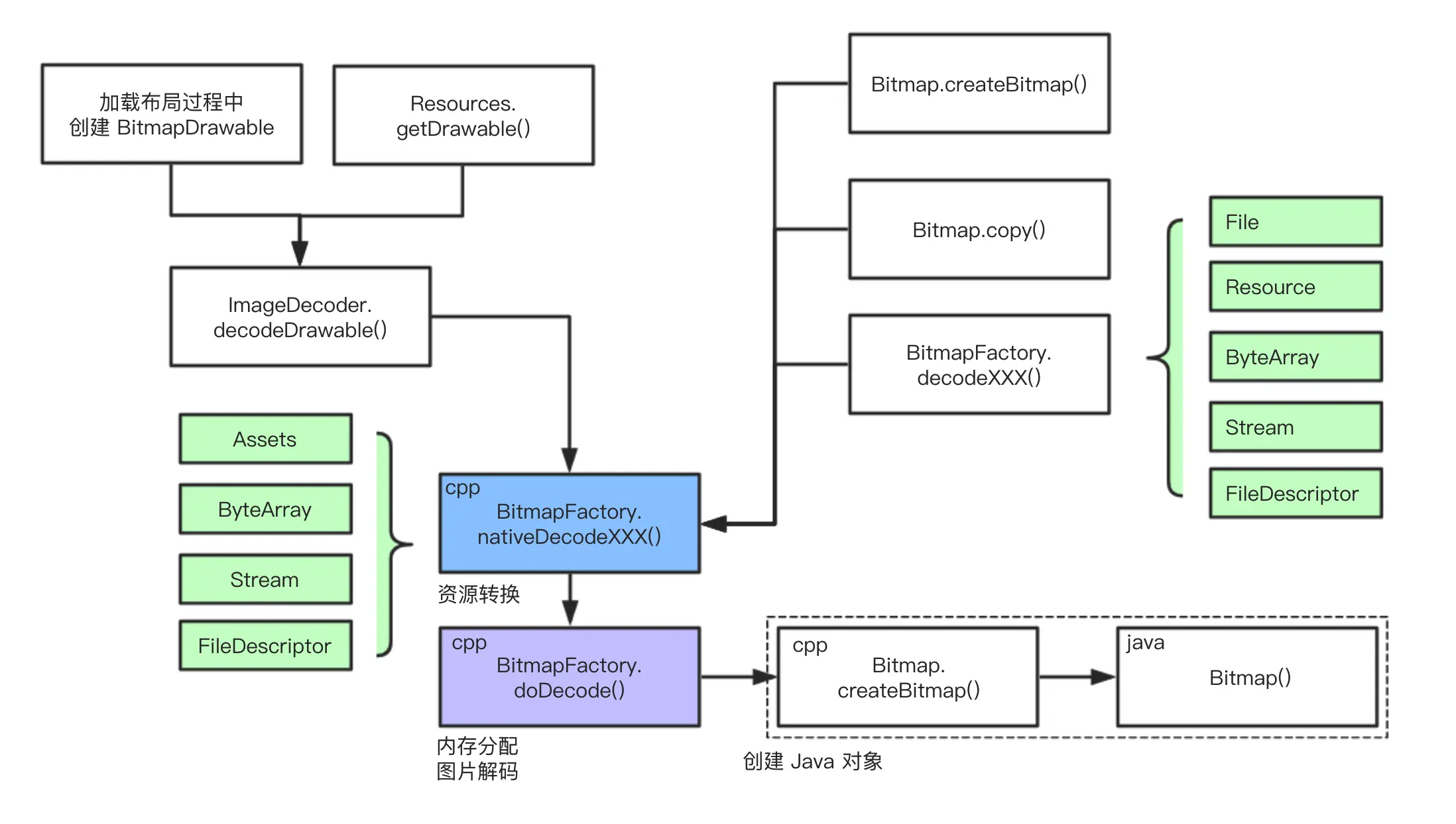 太多的创建 Bitmap 的方式,简直让人头大。但好在无论哪种创建方式,最终殊途同归。见下图: